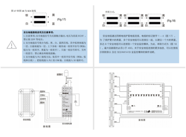 首先客戶需要先了解的是每套安全地毯都會配備一份安裝說明書,一定要將說明書找到并仔細閱讀。安全地毯的出線為四根線,分別是棕黑白藍。安全地毯有兩種接線方式,一種是不接控制器,一種是接控制器。不接控制器時,只需要接棕白,棕藍,黑白,黑藍,任一組,形成回路即可,安全地毯為無源觸點,不需要單獨供電。接控制器時,只需按照控制器上的標識依次將安全地毯的出線接入控制器,然后進行測試即可。